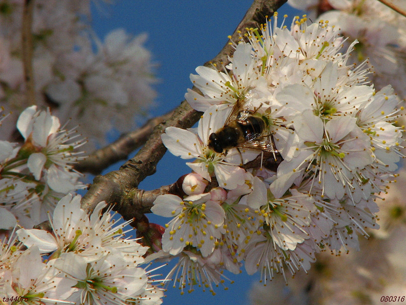 支那実桜(シナミザクラ)といいます。大陸原産のバラ科の木本類で別名「桜桃」、つまりサクランボのなるサクラです。一般にはセイヨウミザクラも桜桃と呼ばれるようですが、本家はこちらのようです。花は小枝にみっしりと付いていてオシベが長く、40本くらいあります。とても芳香が強かったのも印象的でした。一緒に写っているのは暖かい陽気と良い香りにつられて出てきたハナアブです。080316