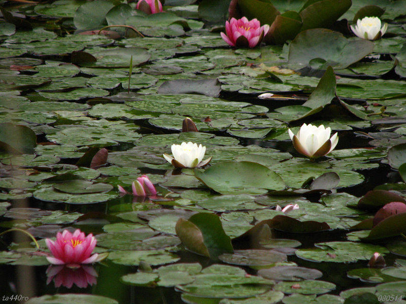 漢字では「睡蓮」と書き、夜になると花を閉じて眠る(睡る)ことが語源となっていると言われます。ならば本家のハス(蓮)は夜に花を閉じないのかというと、こちらも花は閉じるようなのです。睡蓮が敢えて睡蓮と言われる理由は実は他にあるのでしょうか? 睡蓮の和名は未草(ヒツジグサ)といい、こちらは未の刻(午後2時)頃に花を咲かせるからだということですが、日中は花を開いているので、これも正確ではありません。何とも誤解の多い植物だということでしょうか(笑)。080514
