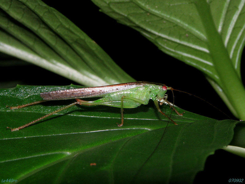 ----真神ゆさんもそう思われましたか・・・・。私もネット上で他のウスイロササキリの画像を探しても複眼は余り赤く写っていないんですね。フラッシュのせいが多少あるとは思いますが、人間の赤目現象とは違いますから、何とも不思議な感じです。