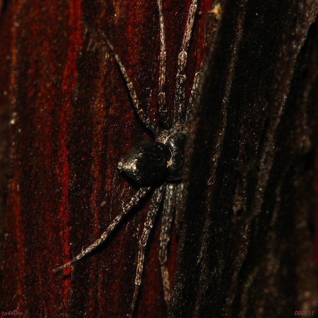 キハダエビグモの♂ですが、まるで映画「エイリアン」に出てきたフェイスハガーのようです。フェイスハガーとは、エイリアンの生活史の一形態で、映画をご覧になった方は分かると思いますが、宇宙飛行士の顔に張り付いたアレです。ただこちらは顔に張り付くどころか、写真を撮ろうとすると、杉の樹皮の奥へ奥へと逃げ回っていました。それでも小さな昆虫にとっては恐ろしい捕食者(プレデター)ですけどね.。080511