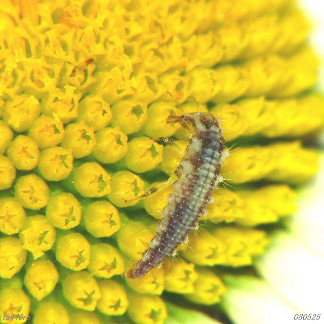 これはシャスターデイジー(というマーガレットに似たキク科植物)の花に来て、筒状花の中を漁っているクサカゲロウの幼虫です。いったい何が目的なのでしょう?アザミウマのような微小な昆虫を狙っているというより、花蜜でも吸いに来ているように見えます。クサカゲロウ類の幼虫はてっきり他の小昆虫を食べるものとばかり思っていたのですが・・・・。080525