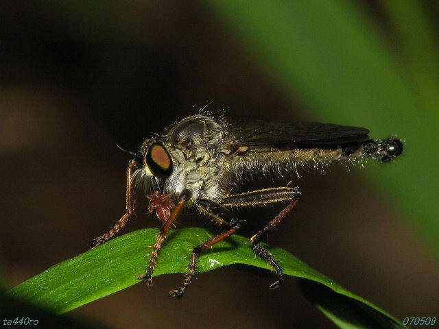 ----今の時期、私のよく行く場所でも、もう一種類はムシヒキアブの仲間が見られます。皆よく似ていて、何という種類なのか、よく分からないのですが・・・・。