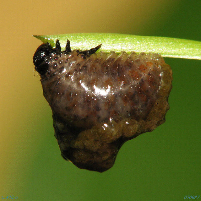 あるヤマノイモに3匹だけ付いていました。自らの背中には糞を背負っているようです。イネに付く虫では有名な「泥負い虫」(イネクビボソハムシOulema oryzae )がいますが、写真はヤマノイモなので別属のヤマイモハムシLema honorata か キベリクビボソハムシLema adamsii 辺りでしょうか? そもそも糞を背負う行動は属を跨ぐほど普通に見られるものでしょうか?070627