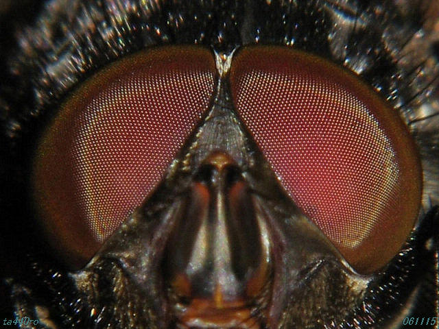 随分と大きな蝿でした。前方から複眼を狙って撮ってみましたが、やはり見事な複眼でした。昆虫の複眼は拡大すると数百から数万という正六角形が集まる幾何的な構造で美しいものですが、それが結ぶ像は如何なるものなのか興味が湧きます。我々のもつような視覚の世界と全く異なるらしいことは想像できます。よくこんな風に見えているだろう、という絵柄がありますが、それを私たち人間が2つの眼で見て納得するのは恐らく見当違いではないでしょうか。