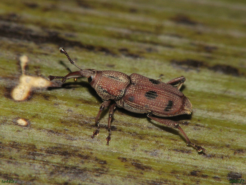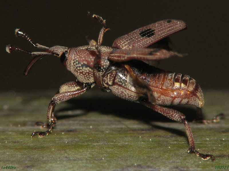トホシオサゾウムシが翅を広げて飛ぼうとしています。このようなゾウムシが翅を広げた姿というのは、精密な模型のような感じです。模型に似ているなんて、比喩が本末転倒なのですが・・・・。080521