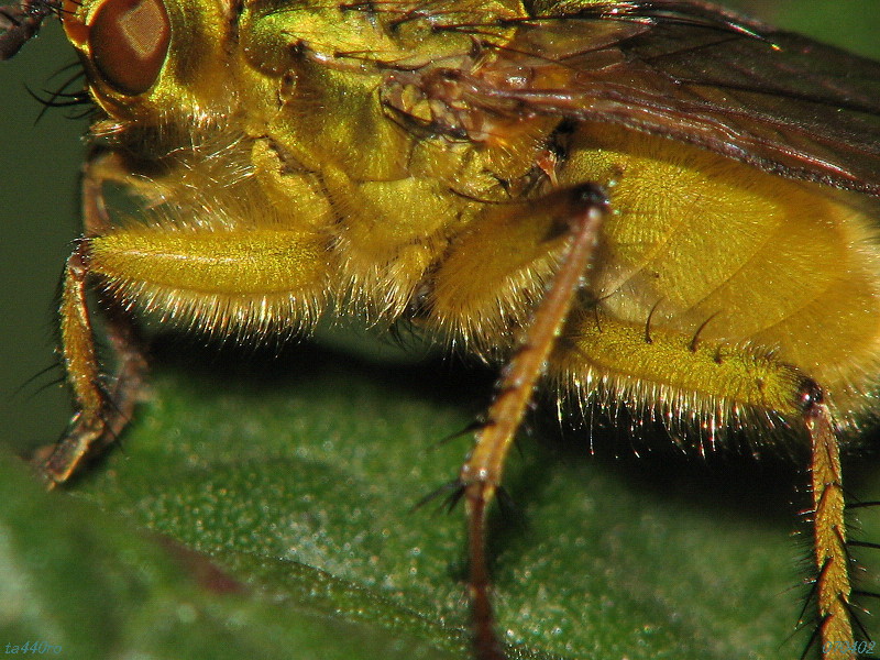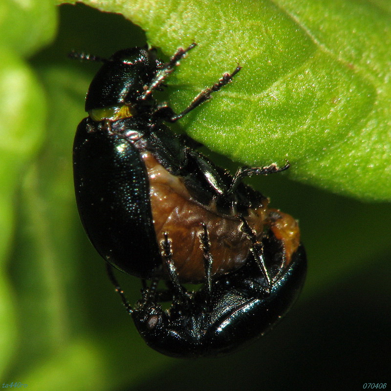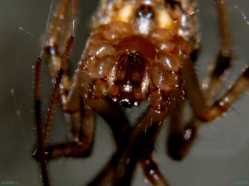 肉眼で見ると丸い腹に金色がかった模様があるようにも見えますが、拡大してみると構造色らしき金属光沢の輝きはないようです。070318
