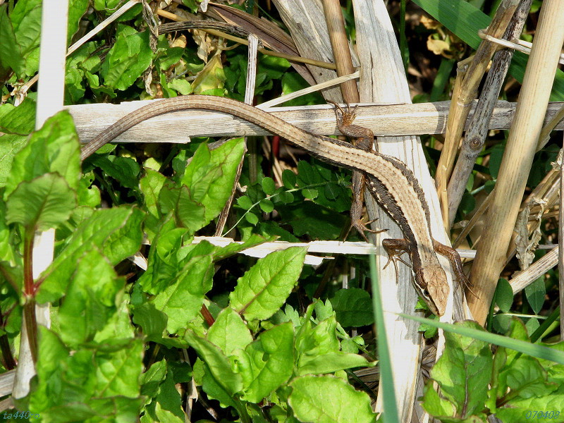 カナヘビはガサガサとした鱗が特徴的で、トカゲのつやつやとした金属光沢のある鱗とは対照的です。頭も四肢も尾もトカゲと比較して長めで、特に尾は全長の2/3以上を占めます。日光浴する場所も、カナヘビは草丈の高い草本類の上だったりしますが、トカゲは河原の大きな石の上だったりします。