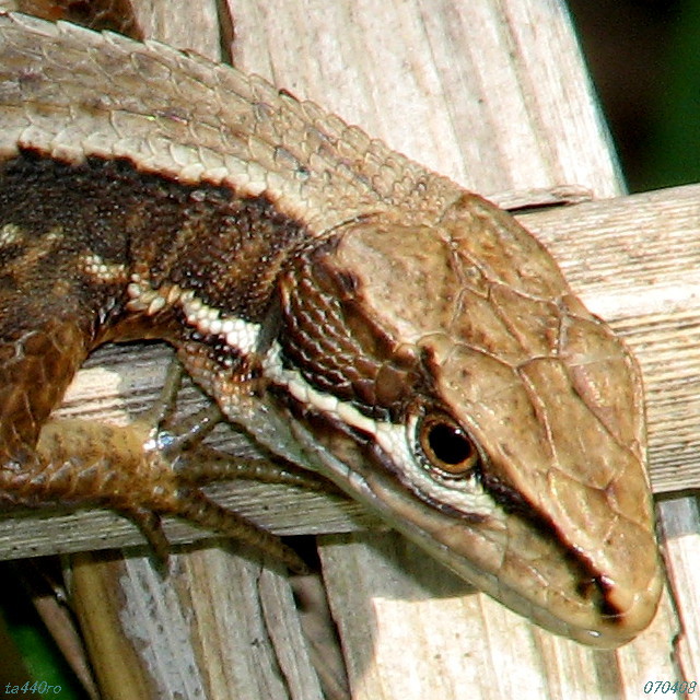 カナヘビの頭の天辺の鱗には「頭頂眼(顱頂眼)」と呼ばれる、光を感じ取る器官が備わっています。この頭頂眼で光を受容し、体温調節を行ったり、サーカディアンリズムをつくったりしているといわれています。頭頂眼は別名「第三の眼」とも呼ばれ、レンズや網膜まで備えているそうですが、レンズと網膜の距離が近すぎて結像はできないようです。そもそも頭頂眼は、眼であったものが進化したものなのか、それとも眼になろうとしている進化の途中なのか、まだ定説がありません。われわれ人間にも「松果体」という同じ起源から進化した器官が残っているのですが・・・・。070408