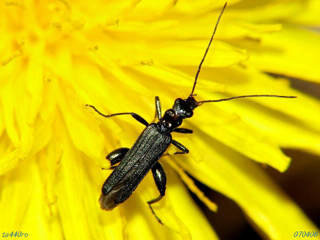 ▼モモブトカミキリモドキもこの花を訪れていた。「モモブト」なのに腿が太くないのはメスだから。