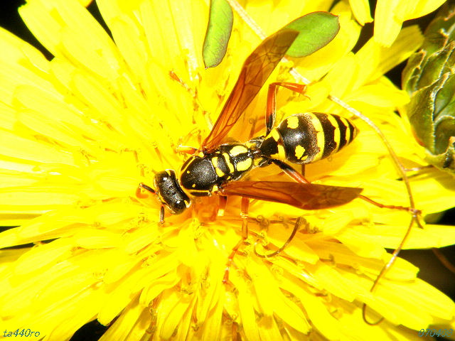 ▼フタモンアシナガバチ 足長蜂というと雑食のイメージもあるし、ヤブカラシの花などに集まるイメージも強いのですが、こんなところでタンポポの花にも立ち寄るんですね。意外でした。070408