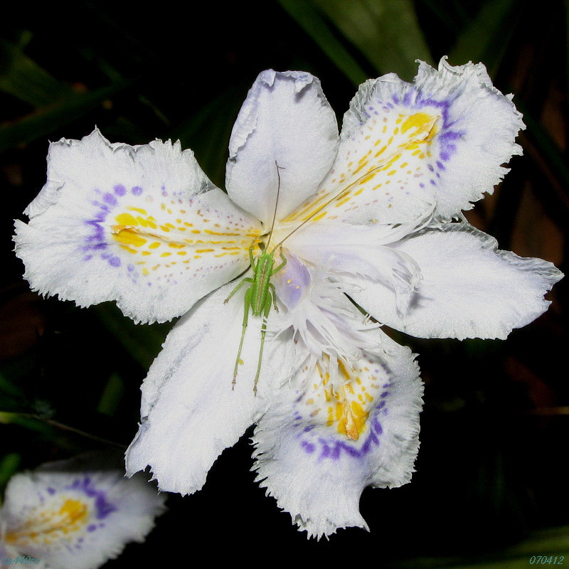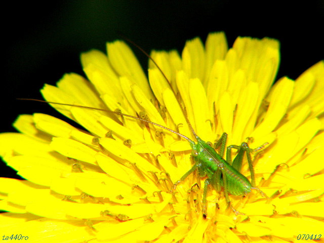 ▼ヤブキリの幼虫 キリギリスの仲間、それもヤブキリの幼虫のようです。単純に葉ばかりを食べるより花の方が好きなようです。花粉など栄養価の高そうなものを好むのでしょうか? 成虫になれば雑食性になり、他の昆虫も捕らえて食べるようになります。070412