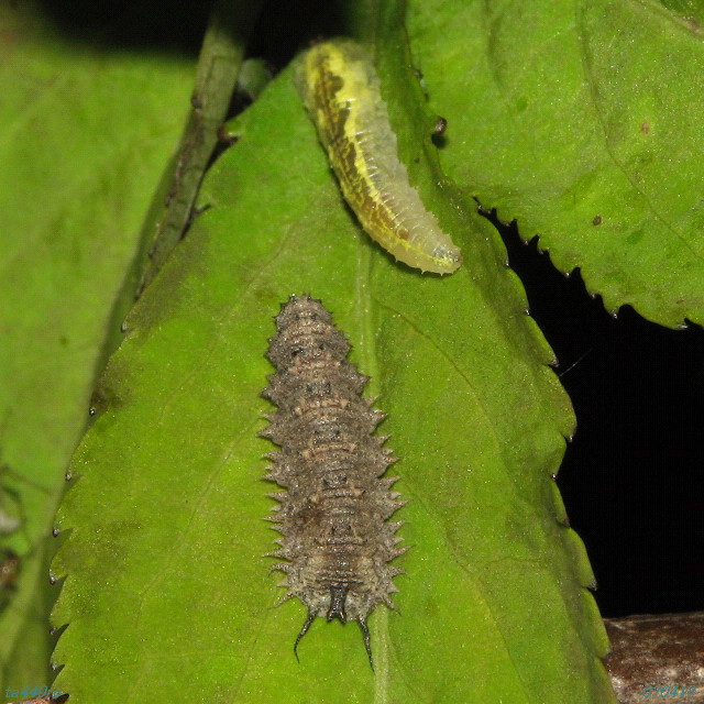 ▼フタスジヒラタブと黄色っぽいタイプ(種名は不明)の幼虫が遭遇した。どうなるかと思って見ていたが、お互いに不干渉で、近づいてきた黄色っぽいタイプの方が移動してしまった。