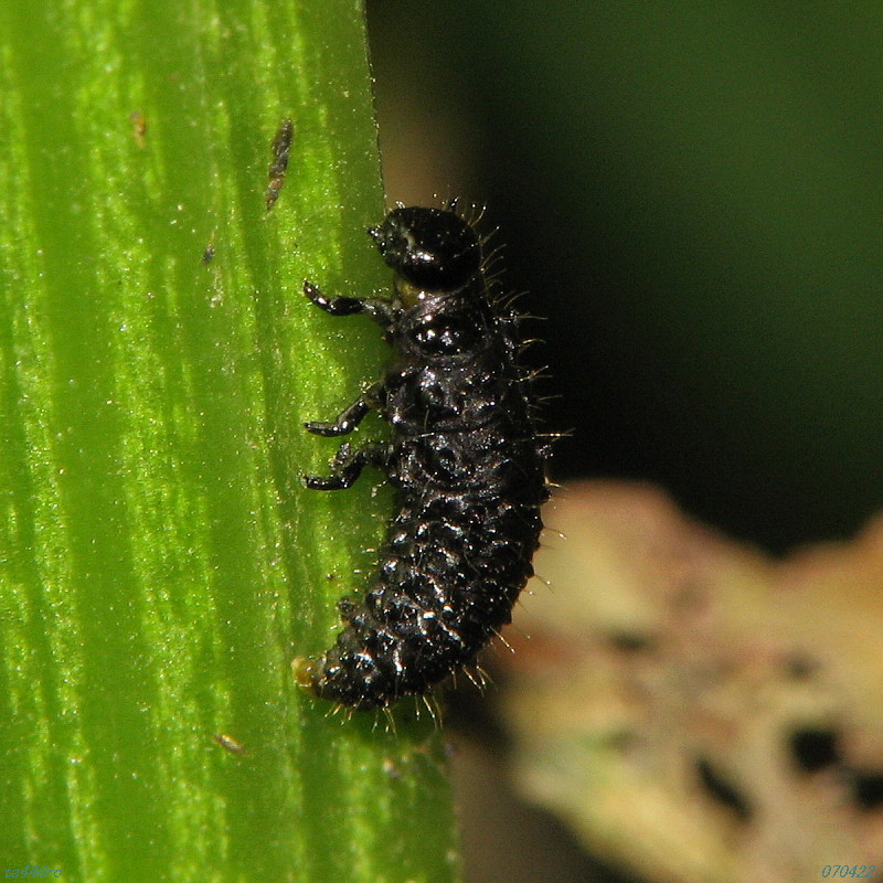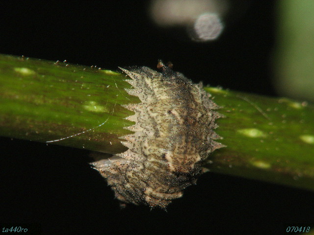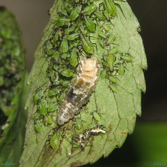 ヒラタアブ類の成虫は花蜜などを舐めたりしていますが、幼虫はアブラムシなどの他の小昆虫を餌にします。アブラムシたちにとっては目の仇である一方、人間たちからは生物農薬としての開発を期待されていたりするわけです。070418
