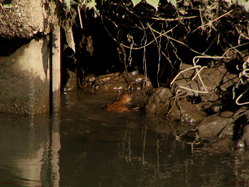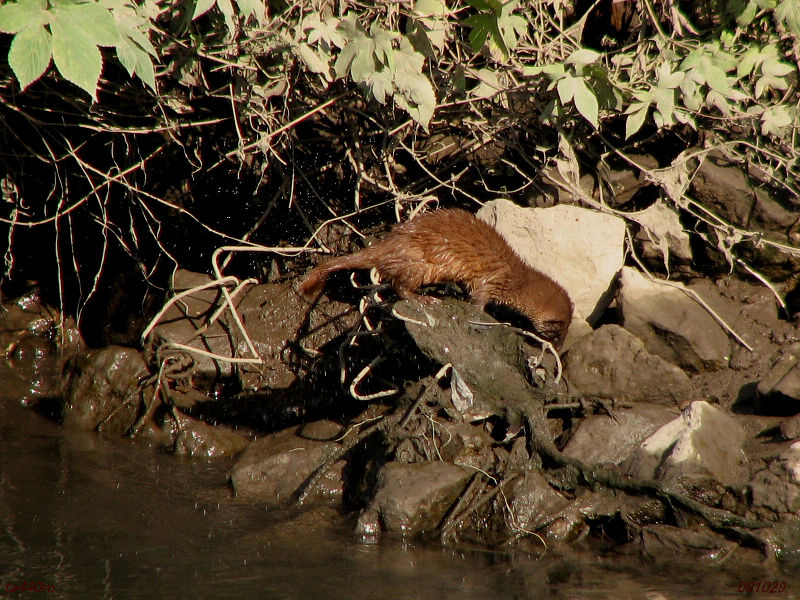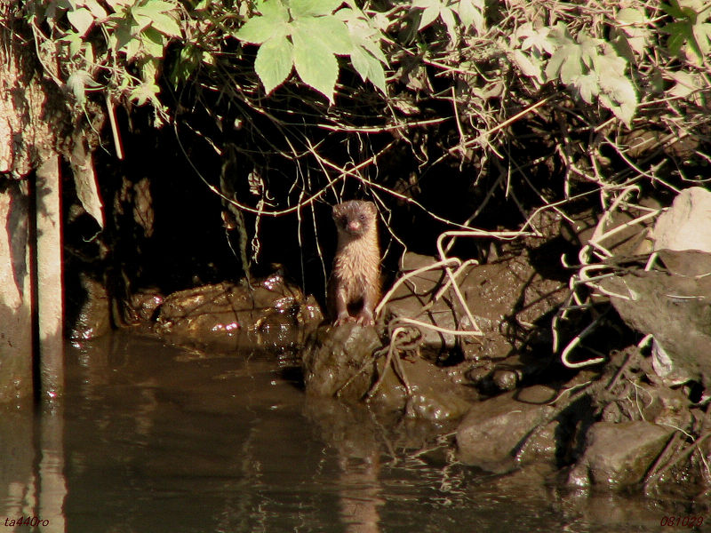 私がよく歩く土手道の反対岸にイタチを見つけました。最初は水際まで来て何をやっているのだろうと思いましたが、そのうちジャバジャバと水に入って、どうやら水浴びのようです。しばしその水浴びを繰り返し、数分後、草叢の中へと消えていきました。081029