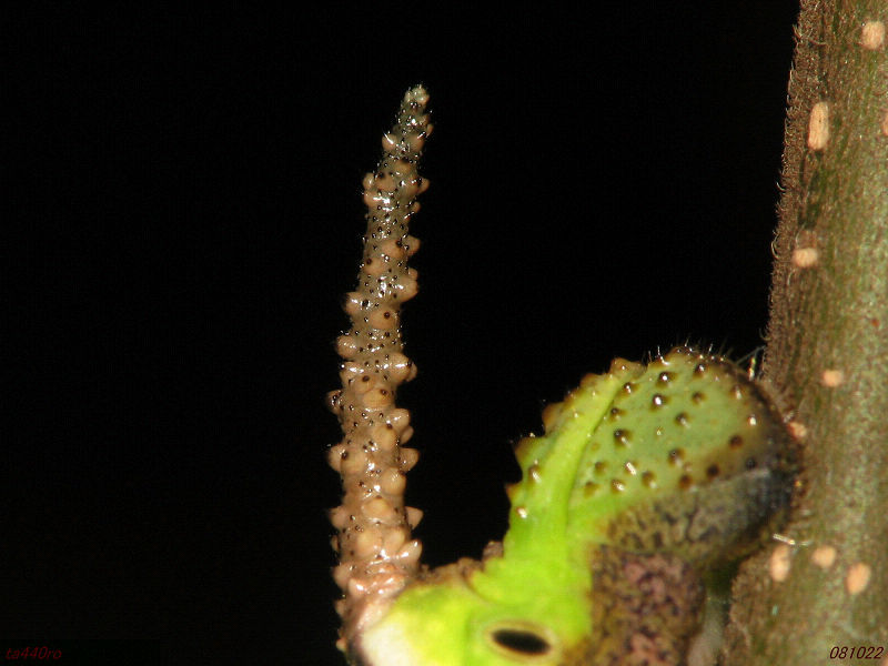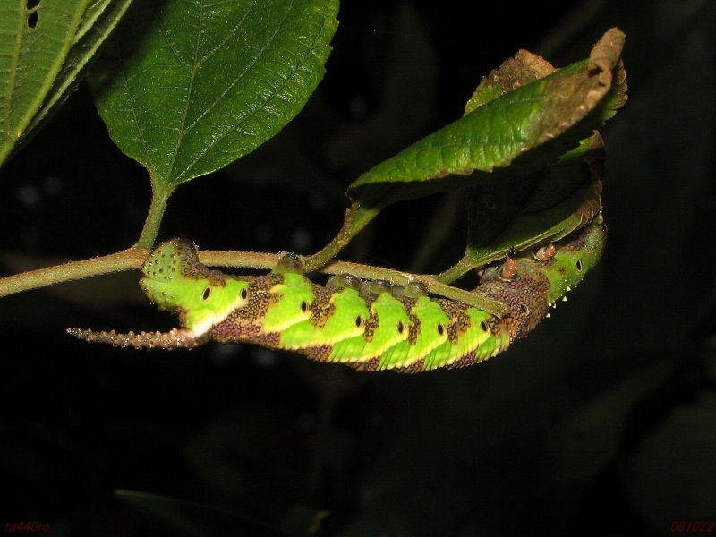 この角と同様に疣の付いた尾角を持つスズメガの幼虫といえば、メンガタスズメやクロメンガタスズメなどがありますが、これらの幼虫の尾角は疣があることに加えてS字状に屈曲しています。てふてふさんのブログで少し前にクロメンガタスズメが紹介されていましたが、次はそんなヤツを見つけてみたいものです。オマケにクロメンガタスズメの成虫は、映画「羊たちの沈黙」のポスターでも有名なドクロの模様のあるあのスズメガです。081022