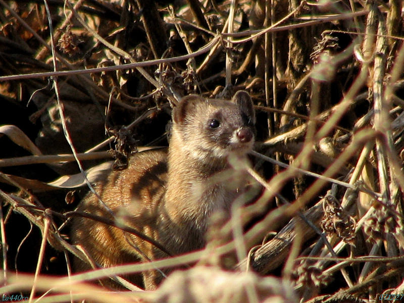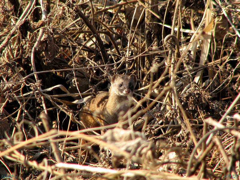 私がよく歩く土手道の反対岸にイタチを見つけました。最初は水際まで来て何をやっているのだろうと思いましたが、そのうちジャバジャバと水に入って、どうやら水浴びのようです。しばしその水浴びを繰り返し、数分後、草叢の中へと消えていきました。081029