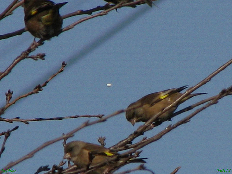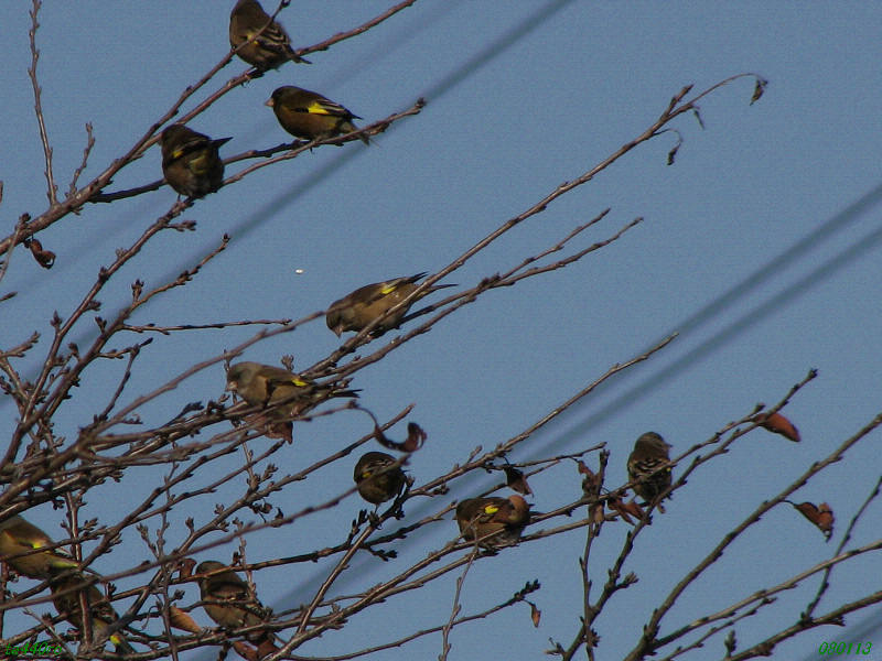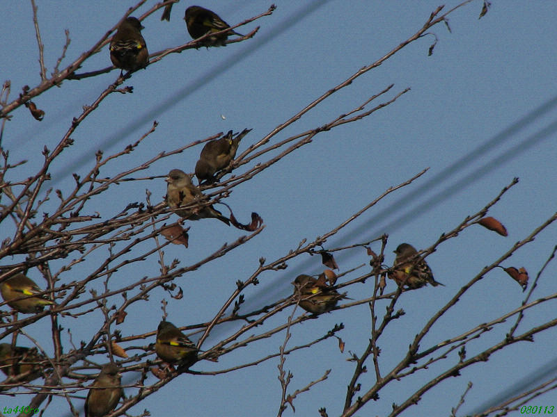 写真は2葉。カワラヒワの群れを写したものですが、どちらの写真にも中央よりやや上、やや左寄りの位置に白い物体が写っています。これが何なのか、お分かりになる方はいらっしゃらないでしょうか?