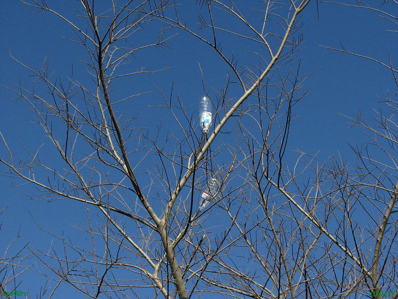 私がよく行くフィールドでのこと。2本の空きペットボトルがすっかり葉の落ちた高い木の枝に引っ掛けてありました。相当高いところで、ご覧のように枝も細く、子供が木登りしていたずらしたにしては無理があります。スズメバチ退治のトラップにしては何の加工もしてありません。果たして誰が何の目的でこんなことをしたのでしょうか?