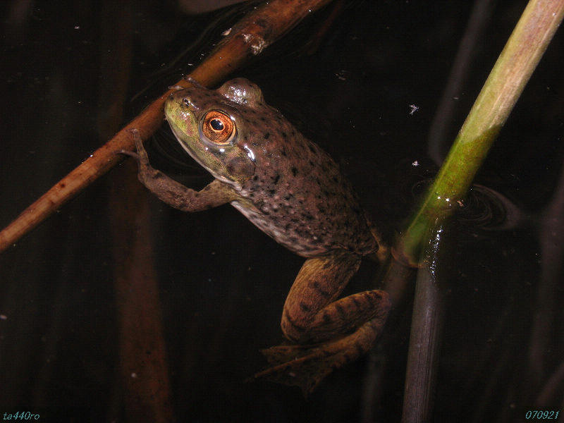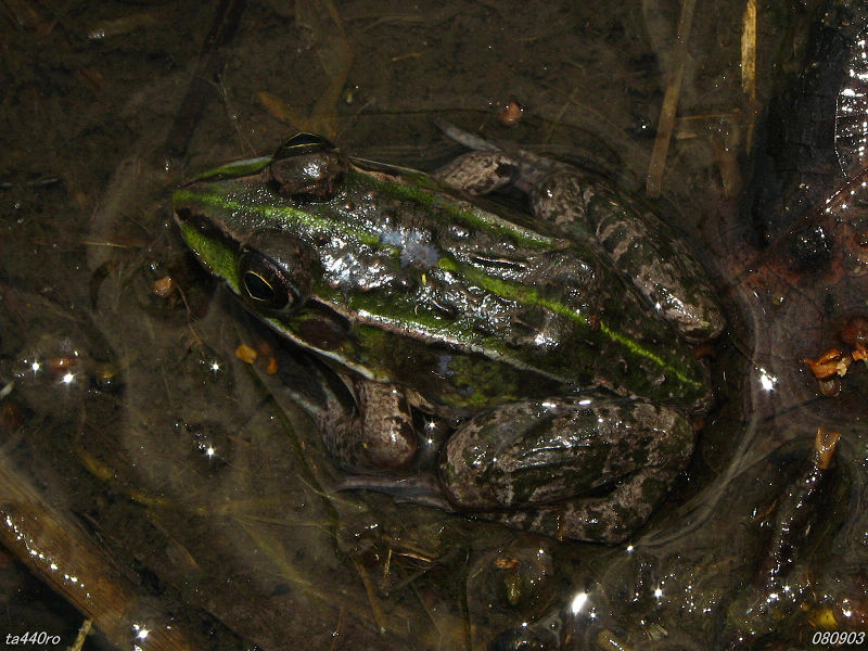 さてこのトウキョウダルマガエル、ちゃんと育つとなかなか立派な大きさになります。某HPではオスより大きなメスで最大87mmと記されていました。昔、6~8cmのトウキョウダルマガエルは普通にいました。ところが一度だけ非常に驚くべきサイズのトウキョウダルマガエルに出逢ったことがあります。殆どウシガエルかヒキガエルのサイズでしたが、模様をみればトウキョウダルマガエル・・・・。おそらく12~13cm以上はあったのではないでしょうか。しかし同じ大きさのウシガエルと比べると、ずっと動きが緩慢で簡単に捕まえることが出来たのを覚えています。080903