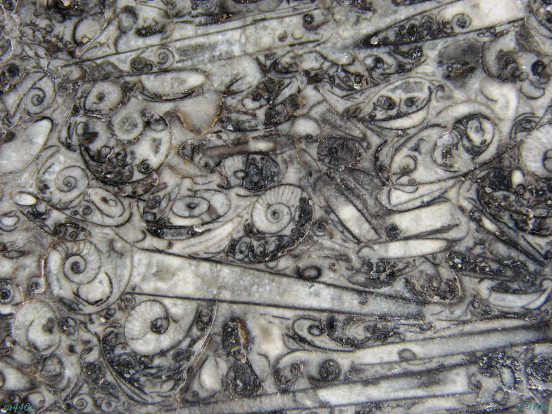 抽象画のようにも見えるこの写真は、2億年もの昔、アンモナイトなどの頭足類が海底に沢山降り積もって大理石と化したものです。どんな生物でも死ねば化石になるというものではなく、好条件が揃わないと難しいといいます。自然の偶然の働きが、生きものの亡骸を永遠の記憶の中に封じ込めてしまったのです。