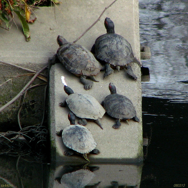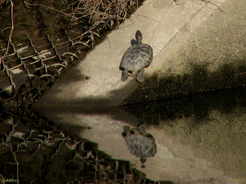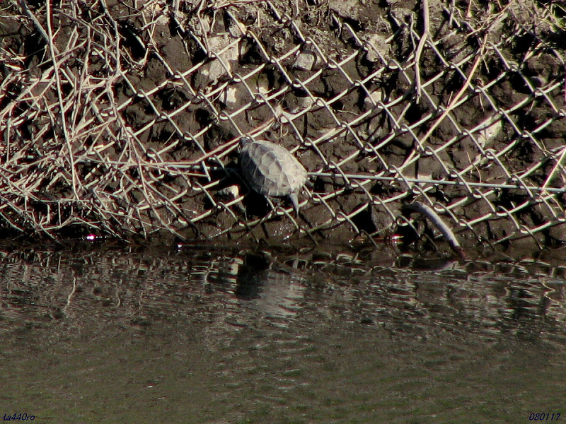 同じ爬虫類であるカナヘビが12月上旬頃、冬眠のために姿を消して暫くが経ちますが、ミシシッピアカミミガメは、暖かい日に甲羅干しをしている姿を見かけます。いったいどれほど寒さに強いのでしょうか? 変温動物とは思えないくらいです。この日、さいたま市の最高気温は14.2度、最低気温は2.8度でした。081229