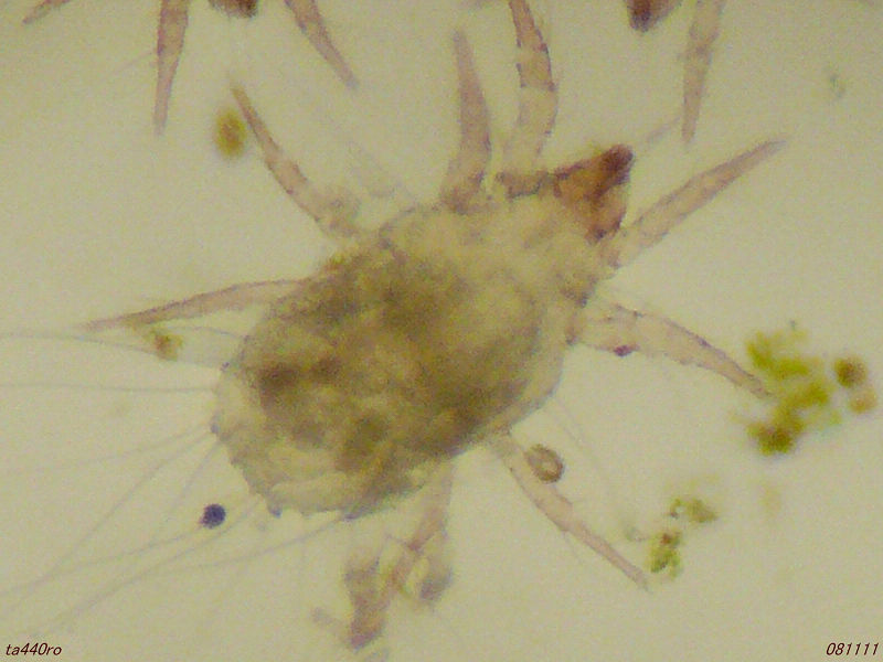 実はこれも同じポトスの瓶の水を取って顕微鏡で見たものですが、不思議なことに以前多く見られたヒルガタワムシが姿を潜め、別の小さな生きものが増えていました。それはどうやらダニの仲間のようでした。調べてみるとダニの中にもミズダニという類があって、水の中にも棲息するのです。ミズダニという類は日本だけで200~300種くらいもあるようで、生憎、私は同定する術を知りません。