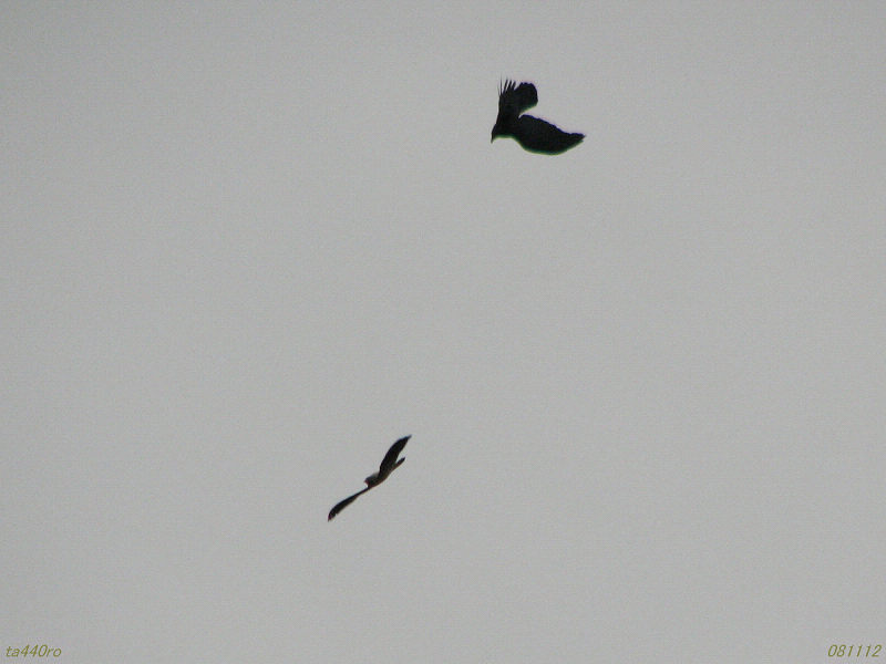▼一難さってまた一難、カラスたちに追われるノスリ。081208