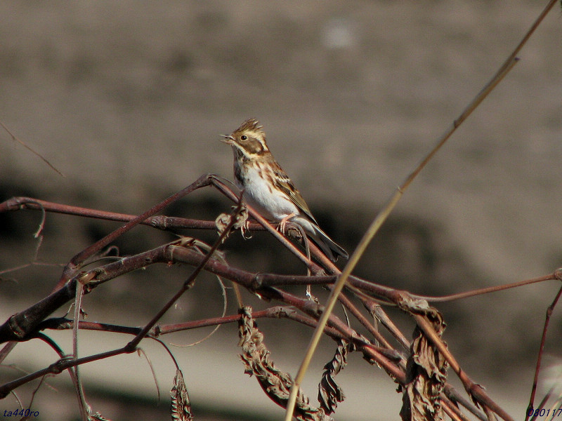 ▼ホオジロのオス。ホオジロの仲間は冠羽が立ち気味の種が多い。080116