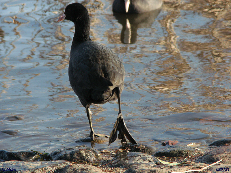 オオバンもバンも湿地を歩くとき、ぬかるんだ泥に足を取られないように非常に大きな足を持っています。ところがその形状は比べてみると驚くほど違います。バンの足は普通の鳥の足をただ大きくしたような形ですが、オオバンの足はまるでカエデの葉のような平たい縁取りがあるのです。そのおかげでオオバンは速く泳げるという訳です。080131