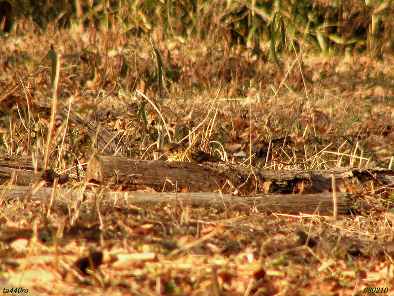 一方で信憑性があると感じたのは、関東の方言でしゃがむことをつぐむといい、それに由来する、という説です。関東の方言でしゃがむことをつぐむというのか否かは知りませんが、ツグミは地面の上に直に降り立って、ちょっと嘴を上に向け、つんとした姿勢でいることが多い鳥です。広々とした地面に数羽が離れてポツンポツンと立ち尽くす鳥はそれほど多くありません。その姿を人がしゃがんでじっとしているように擬人化して見るのはそれほど無理がないように思えます。080131