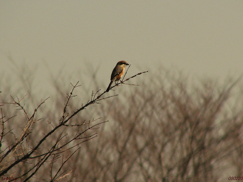 ▼ニシキギの枝に止まるモズ。080220