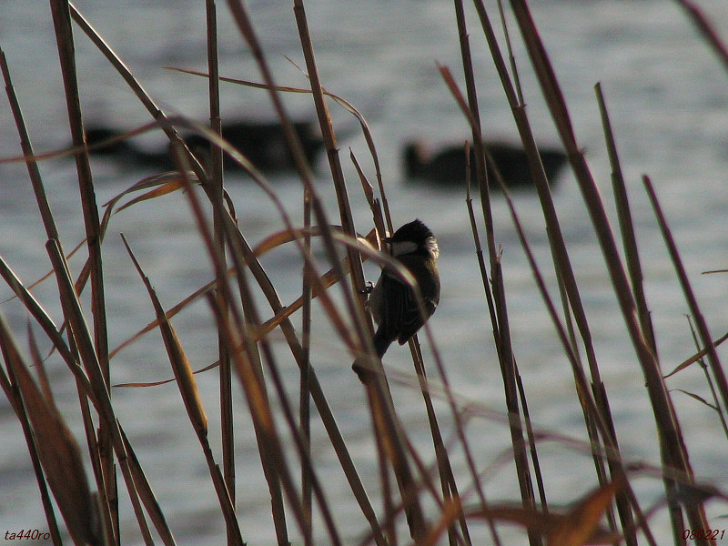 下の写真はシジュウカラです。街にも郊外にも普通に見られるオールラウンドプレイヤーです。湿地のアシにもやって来て、この通り、アシ専門のオオジュリン顔負けのポーズで茎の中の虫を漁っているようです。