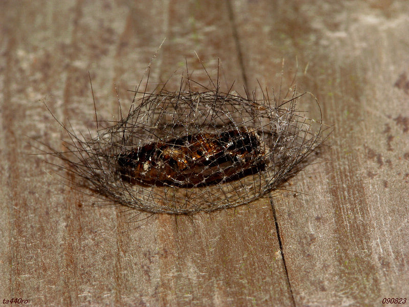 この繭、見れば見るほど不思議です。毛虫(幼虫)が、自分の毛を抜いて作ったような滑稽な想像を働かせてしまいますが、実際にどのようにこの繭をつくるのか見てみたいものです。