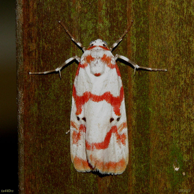 尚、コケガという名前は幼虫が一般にコケ(地衣類?)を食べることからついた名前です。このアカスジシロコケガも何か地衣類を食べて育ったのでしょうね。090823