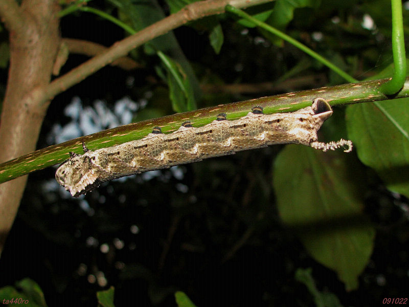 10月22日、とりあえず自宅に持ち帰り、飼育ケースの中でクサギやダチュラの葉を餌として与えていたところ、11日後の11月2日、土の中に潜ってしまいました。今のところ、潜ったままのようですから、来夏、寄生虫などにやられることなく無事に羽化し、あの髑髏模様が拝めるのを楽しみにしています。091022