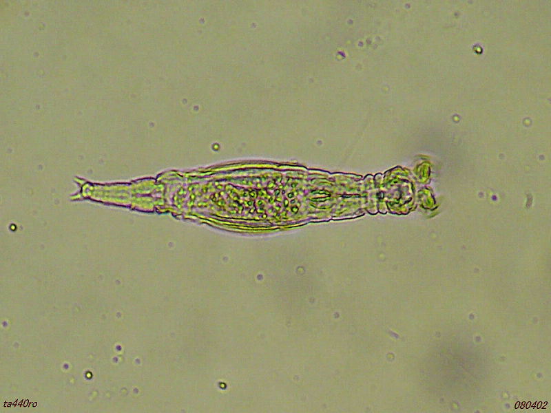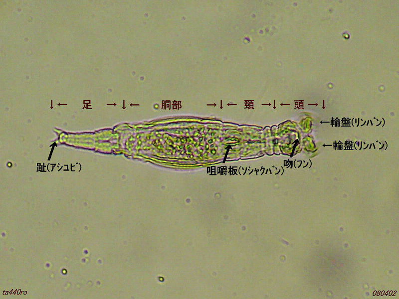 ヒルガタワムシというのは、かなり大きな括りで1種類ではありません。輪形動物門輪虫綱ヒルガタワムシ目に属する複数の科から成り立つ一群です。分類は咀嚼板の形などをしっかり見ないといけないようですが、生きている間は伸び縮みするし、死んでしまうと縮んでしまうし、非常に見分け難い仲間のようです。ただ伸びているときの体の様子を一時的に写真に写し撮ったりすれば、大まかな体のつくりは分かります。特徴的なのは輪盤といわれる繊毛のある部分でこの繊毛を動かして水を吻に流し込み、餌を摂るのだそうです。