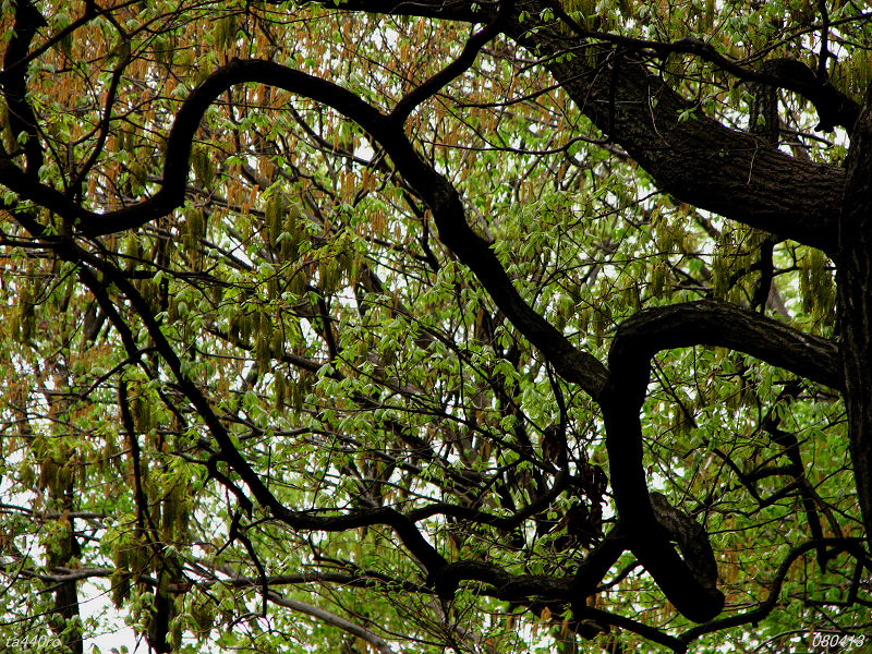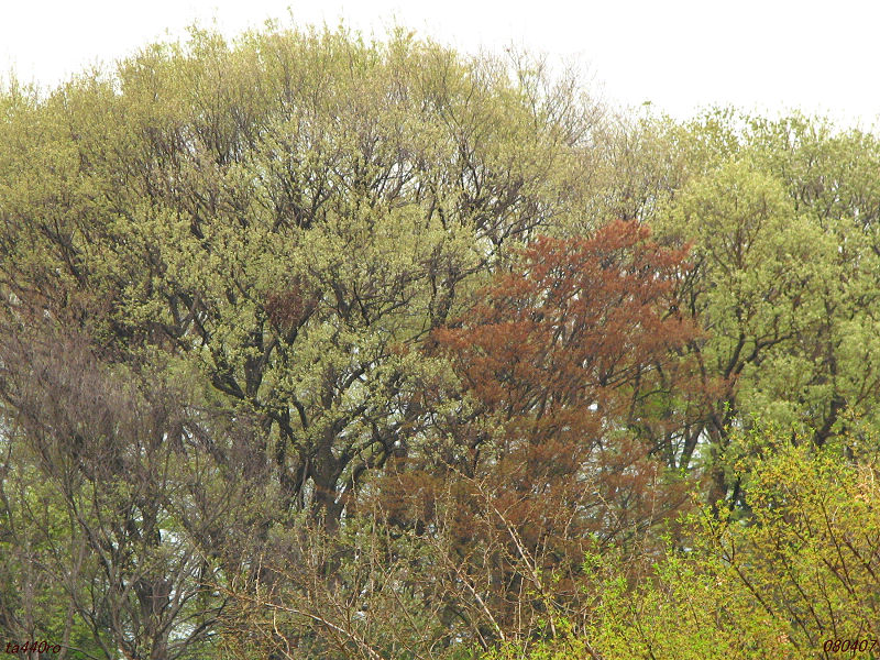 雑木林の前で長い望遠レンズを付けたデジタル一眼レフが数本並んでいました。その近くから歩いてきたバードウォッチャーの一人に聞くとアオゲラが巣づくりをしているとのこと。私も覗いてみると、なるほどアオゲラが木の幹に大きな穴を開けています。作業の合間に時々こちらを伺っている様子は、人間たちの行動がかなり気になるからでしょう。私は数枚の写真を撮るとさっさと立ち去ることにしました。他の撮影者たち数人はどうやら長居を決め込んでいる様子です。アオゲラの巣づくりを邪魔しなければよいのですが・・・・。080416
