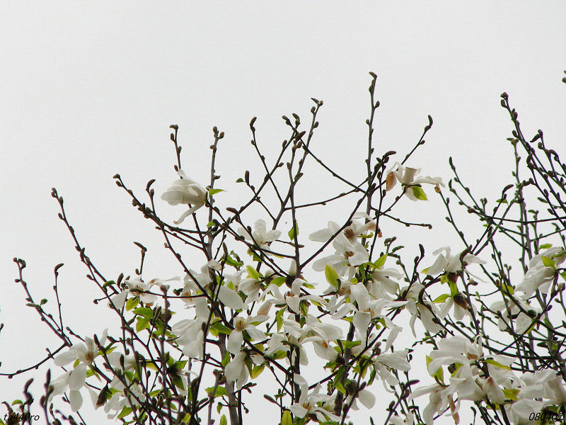 モクレン科の花でも特に白いものは清楚な感じがしますが、コブシもその中の一つと言えるでしょう。昨秋、コブシの実が落ちていた公園で http://ta440ro.blog.shinobi.jp/Entry/400/ 、この春、咲きました。ハクモクレン http://ta440ro.blog.shinobi.jp/Entry/519/ とはまたひと味違う若々しさも感じ取れます。それはやや小振りの花であることと、花の元に黄緑色の若葉を1枚だけ備えるからかも知れません。080407