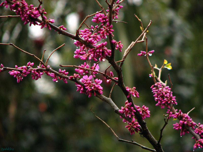 ▼ハナズオウの花も雨で蕾を固く閉ざしたままのようだ。