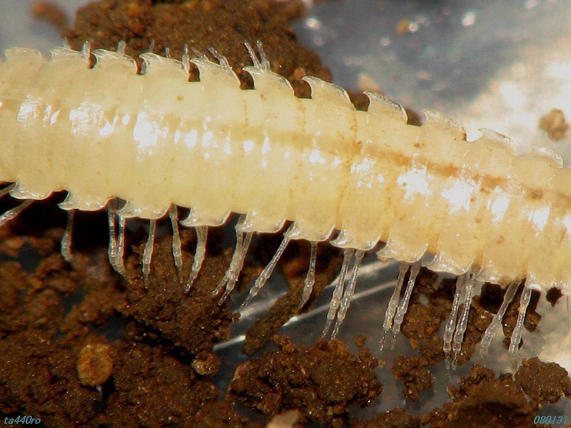 ▼ヤスデの仲間の体節を拡大してみると、1節について脚が2対つまり4本付いている。これが「倍脚類」と呼ばれる由縁である。080131