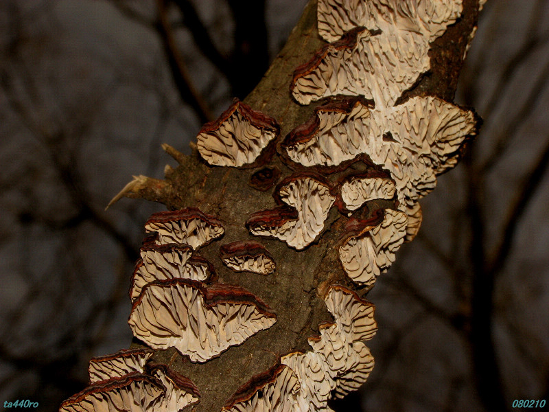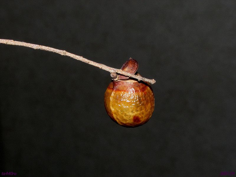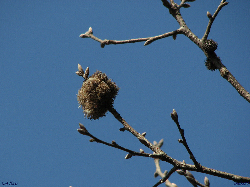 調べてみればクヌギエダイガフシという虫瘤です。これはクヌギエダイガタマバチという蜂の仕業によるものだそうですが、このクヌギエダイガタマバチというのが曲者で、晩秋に全てメスとして羽化し、雄花の花芽に産卵した結果、クヌギハナコツヤタマフシという別の形状の虫瘤ができます。ここから羽化したオス、メスが次世代を残すために若枝に産卵した結果、このクヌギエダイガフシという虫瘤ができるのだそうです。何とも複雑な生活史です。しかもクヌギハナコツヤタマフシを作るタマバチはかつては別種だと思われ、クヌギハナコツヤタマバチという和名もあったのだそうです。