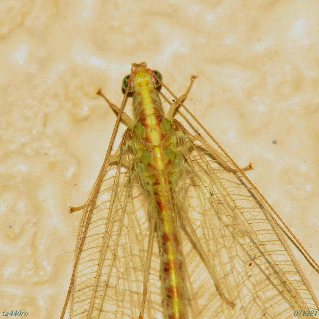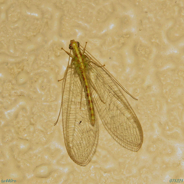 腹部に赤いダンダラ模様の出るクサカゲロウです。いろいろな方たちのブログに恐らく同一種と思しき写真が掲載されているのにどういう訳か「クサカゲロウ」という表現で、種名がないようです。そして撮影は12月から3月頃の寒い時期のものばかり見つかります。はてさて・・・・。071221