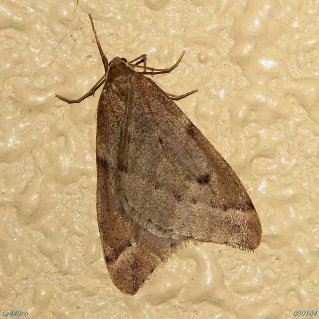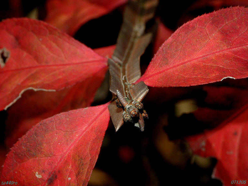一般に「冬尺」とは、成虫が冬に出る尺蛾という意味で、日本には36種類が生息しますが、メスは翅が全くないか飛べない程度の翅に退化しています。このクロオビフユナミシャクのメスは飛べないながらも、冬尺にしては翅が大きく残っているそうです。私自身は冬尺類のメスを見たことがないので、それらメスを1つでも2つでも写真に収めるのが今後の課題でもあります。071222