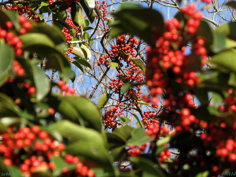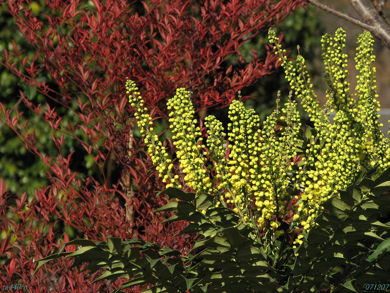 ヒイラギナンテンはアジア大陸原産で春の花というイメージがありますが、これを撮影したのは12月上旬です。疑問に思ってネット上で調べてみると、これはセイヨウヒイラギナンテンの園芸品種「チャリティー」と言われているものによく似ています。花期もセイヨウヒイラギナンテンは11月~1月と普通のヒイラギナンテンよりもだいぶ早く、撮影時期と一致します。メギ科のmahonia属はアジア大陸から北アメリカ大陸にかけて分布しているそうですから、この起源はアメリカ生まれかも知れませんね。071207