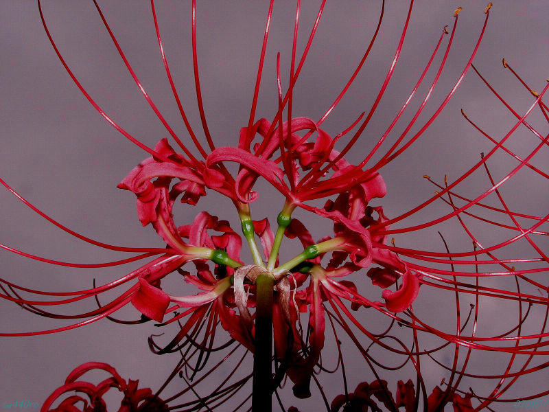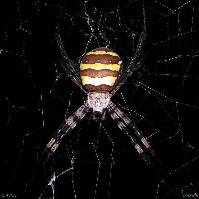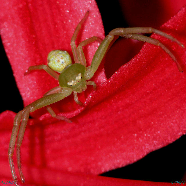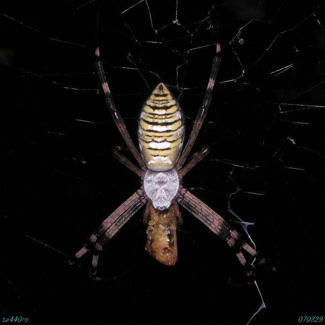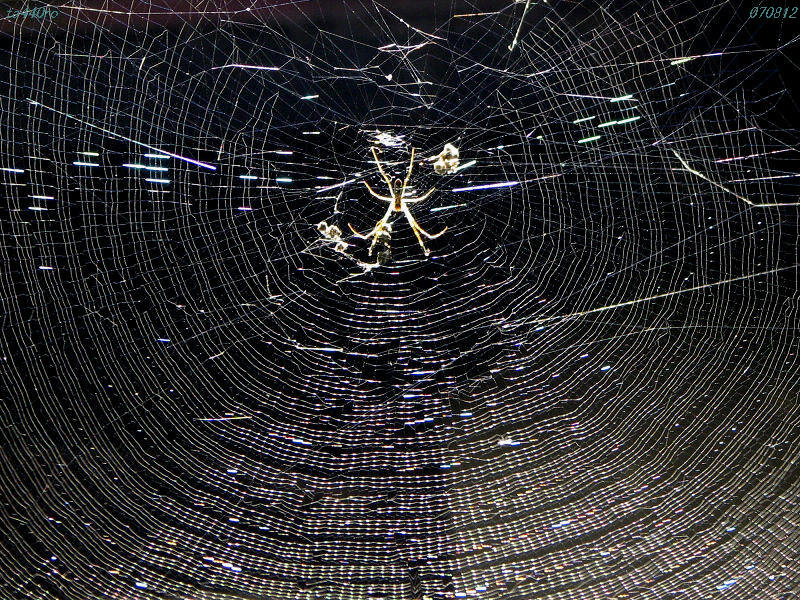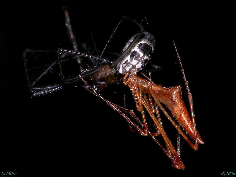 後から襲っているのがヤリグモ♀、襲われているクモはアシナガサラグモ♂です。ヤリグモは恐ろしい奇癖の持ち主で、網の主そのものを襲って食べしまうのです。サラグモの仲間はよく犠牲になるようです。071005