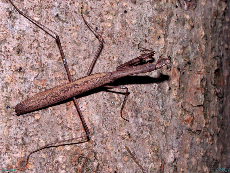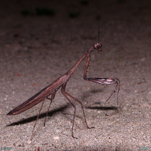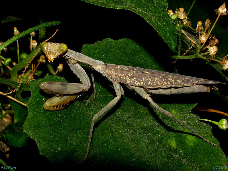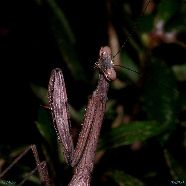 ▼ハラビロカマキリの褐色型。複眼や前脚が緑がかって不思議な色を呈している。翅の色柄もまるで「唐草模様」のようである。070824