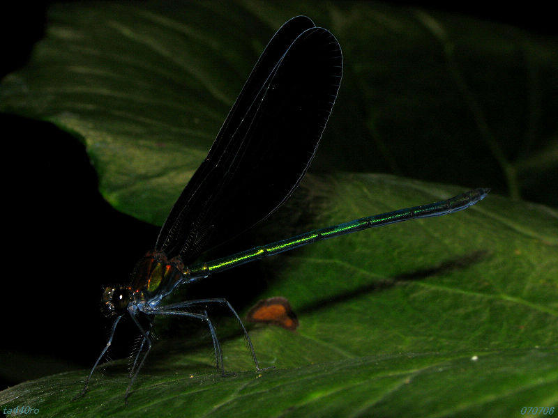 今回はハグロトンボのオスです。陽光でもフラッシュ光でも緑色にピカピカと反射します。