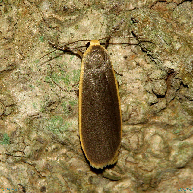 また食餌植物が判っているものの中にも意外なものを食べている蛾もいました。例えばヒトリガ科には地衣類を食べる蛾の仲間がいて、コケガといわれます。地衣類というのは樹皮などに生えている菌類と藻類の共生生物、例えばウメノキゴケのような「コケ」のことですが、そんな変わった生物を食べて育つわけです。