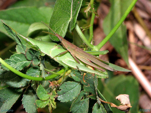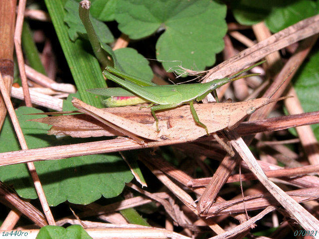緑色か褐色かは何によって決まり、どのようなタイミングで変わるのか、私には今ひとつ分かりません。昨年の秋には、緑色だったオンブバッタの成虫が褐色に変わったように思うのですが、エビなどと違い、成虫になってからは色は変わらないはずである、と言われる方も大勢いて、はて、私の勘違いだったのだろうか?といぶかしんでいます。出来れば昨年と同じ状況が観察できればいいと思っていますが、生憎、今年の自宅の庭にはオンブバッタが少ないようです。070921