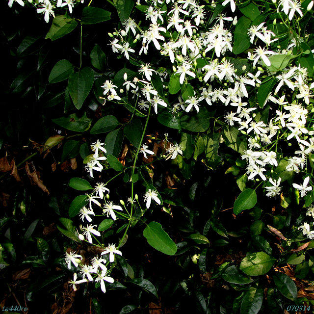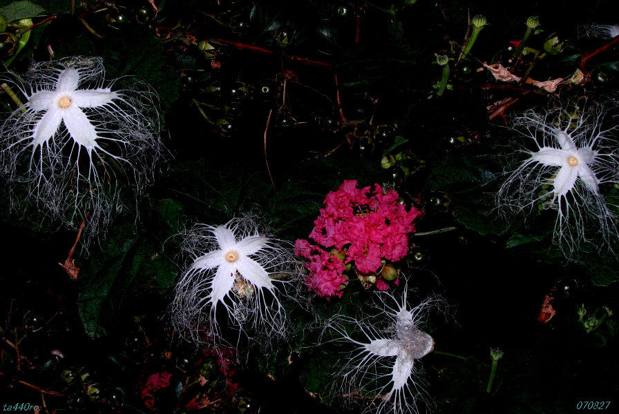 それは受粉の運搬に関係しているという説があります。つまり・・・・雌雄異株の花が夜間に咲き、とても香りがよい。花筒が非常に長く、花弁は大きく広がっている。そのため、香りに惹かれて飛んできた口吻の長いスズメガ類のみが停空飛翔しながら吸蜜し、効率的に受粉を行う。他の昆虫は夜間の移動能力も余りないため、受粉については戦力外とされ、周辺に止まって吸蜜することから遠ざけられている。・・・・これもまたおそらく真実でシビアな世界ですが、一方でそれだけで割り切れないような気がするのも確かです。070827